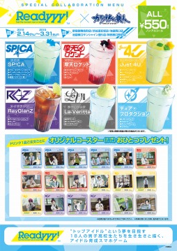 ディア・プロダクションと5つのユニットをイメージしたノベルティ付きオリジナルコラボドリンクを各550円(税込)で販売します。ノベルティとして、コラボドリンク1杯の購入につき1枚のコースターを全18種からランダムでプレゼントします。コラボドリンクのラインナップは「SP!CA」「摩天ロケット」「Just4U」「RayGlanZ」「LaVeritta」「ディア・プロダクション」の6種で、いずれもテイクアウト可能です。