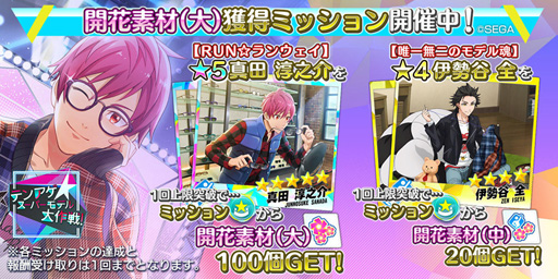 「★5【RUN☆ランウェイ】真田淳之介」と「★4【唯一無二のモデル魂】伊勢谷 全」のメモリーズフォトを1回上限突破するとミッションクリアとなり、それぞれ「開花素材(大)」100個、「開花素材(中)」20個が手に入ります。