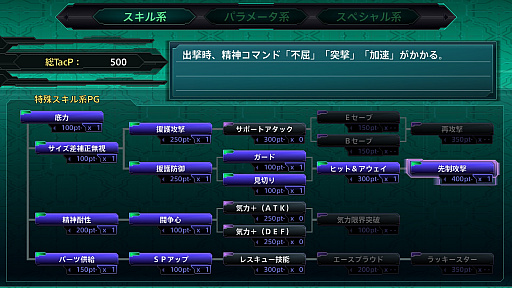 ただし、特殊スキルは最初から全てが揃っているわけではなく、画面の左上にある「底力」からルートに従い、TacPを消費して開発していきます(画面写真のルートで表記が暗転している特殊スキルは未開発の物です)。