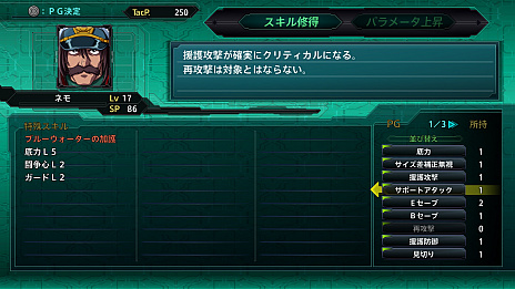 援護攻撃……………隣接する味方に続いて攻撃を仕掛ける(与ダメージは通常時の0.5倍)。1ターンにスキルレベルと同じ回数が発動可能。