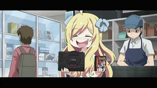 16-bit と書かれた黒いゲーム機向けの「ファニッシャー」というソフトを邪神ちゃんが購入したりと,独自のゲームネタをかましてきます。こと2期は何かリミッターが外れた様子で,将棋の「香車」からの連想で「XYZと書かれたハンマー」が登場し,ゴミ箱から拾った食物を食べて奇異の目を向ける衆人に邪神ちゃんが「同情するならカネをくれ!」と叫ぶなど,1990年前後のネタがバンバン飛び出します。