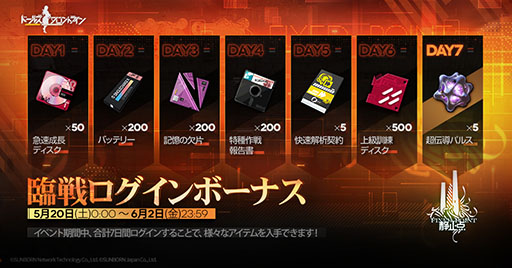 さらに,5月26日にスタートする大型イベント「静止点」に向けて,「臨戦ログインボーナス」が5月20日0:00から6月2日23:59まで開催される。こちらでは,ログイン日数に応じて,「バッテリー」「記憶の欠片」各200個や「急速成長ディスク」50個などを受け取れるとのこと。