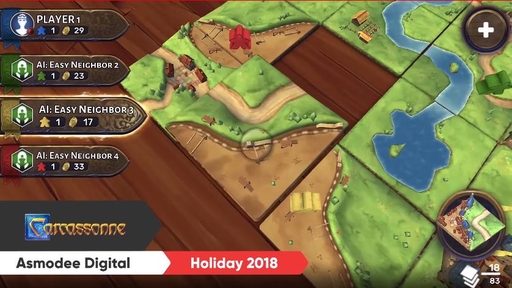 (海外:2018年ホリデーシーズン,日本:未定)ボードゲームの権威ある賞となっている,ドイツ年間ゲーム大賞を受賞した「Carcassonne」(カルカソンヌ)のNintendo Switch版。画像でも分かるように,タイルを並べて都市を作っていく。