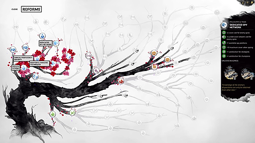 本作のテクノロジーツリーは,「Reform」と呼ばれる,政策の発展を表現したものとなっている。そこにポイントを振り分けていくことで,より多くのスパイポイントを得たり,多くのスパイを暗躍させられるようになるようだ。