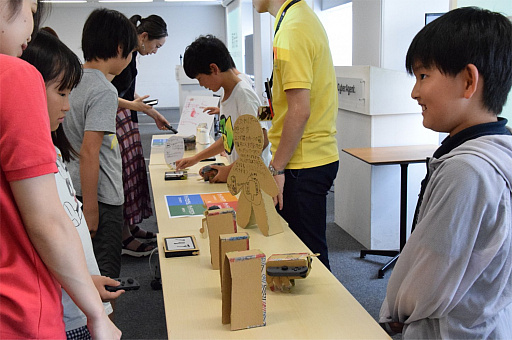 全員の発表が終わると,展示会がスタート。参加者は半分に分かれてテーブルに作品とポスターを展示し,残りの子どもと保護者は会場を自由にまわり,体験したり,作者に質問したりした。