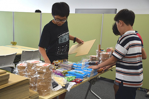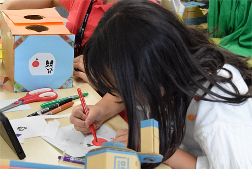 自由に作品を作れるよう,会場にはダンボールや厚紙,折り紙,セロファン紙などのさまざまな材料や道具が用意されていたが,持ち込みもオーケーということで,自宅から空き箱を持ってきた参加者もいたようだ。