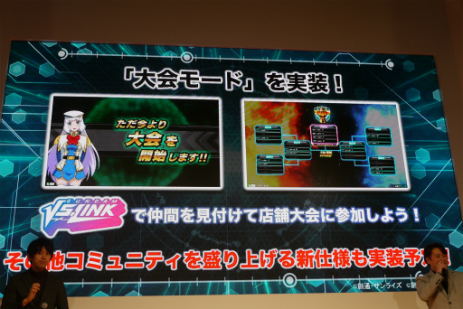 大会形式でプレイできる新モードの実装も予定されている。大久保氏は「まずは前作までに存在していたような,店舗が大会を開ける機能を実装します。公式コミュニティ『ガンダムVS.リンク』などで大会を探して,エントリーしてほしいです。今後はプレイヤーの皆さんが使える機能も盛り込んでいきたい」と語っていたので,続報にも期待したいところだ。