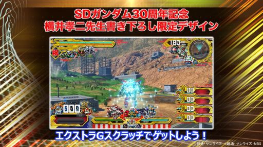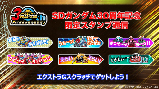 2019年春には,SDガンダム30周年を記念したキャンペーンが実施される。カードダスの絵柄が入った限定スタンプ通信に加え,SDガンダムシリーズのメインデザイナー 横井孝二氏がデザインを手がけるカスタマイズアイテムが,「エクストラGスクラッチ」で入手できるとのこと。