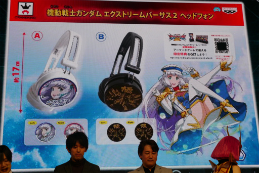 プライズ商品となる「機動戦士ガンダム エクストリームバーサス2 ヘッドフォン」も披露された。セシアのイラストが入ったホワイトと,エクストリームガンダムと「極」の文字がデザインされたブラックという2種類の展開で,セシアをモチーフにしたスタンプ通信も特典として入手できる。こちらのヘッドフォンを持参して,EXVS2に参戦すればモチベーションも高まるだろう。