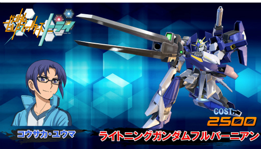 アニメ「ガンダムビルドファイターズトライ」に登場したガンプラ,「ライトニングガンダムフルバーニアン」 が新規参戦機体の第3弾として登場する。コストは2500で,「モビルアーマー形態への変形を活かしつつ,豊富な射撃武装で戦う万能機」(大久保 人氏)とのこと。