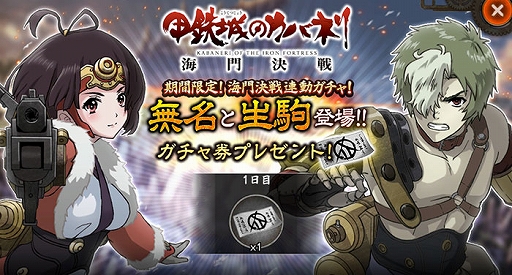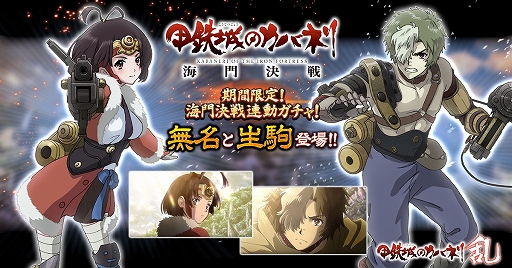 「甲鉄城のカバネリ -乱-」,劇場版「甲鉄城のカバネリ 海門決戦」と連動したガシャを配信。海門決戦の「無名」と「生駒」が登場