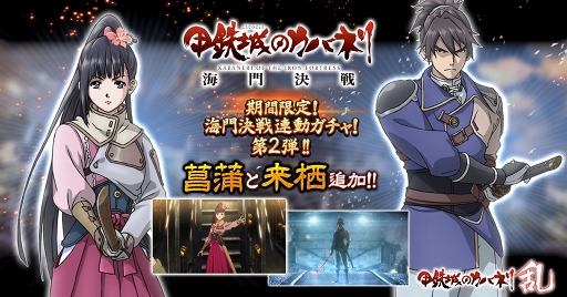 合同会社DMM GAMES(本社:東京都港区、最高経営責任者 社長:村中 悠介、URL:https://games.dmm.com/ )と株式会社トライフォート(本社:東京都渋谷区、代表取締役CEO:大竹 慎太郎、URL:https://trifort.jp/ )は5月10日(金)に劇場中編アニメーション「甲鉄城のカバネリ 海門決戦」と連動した、海門決戦連動ガチャ第2弾を開始したことをお知らせいたします。海門決戦の衣装を纏った「菖蒲」「来栖」がガチャから登場します!