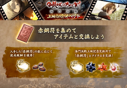 イベントで入手できる「赤銅符」を指定個数集めることで達成報酬を獲得できます!さらに、集めた「赤銅符」を「覚醒焔【金】」や「昇格結晶【皆伝】」などの豪華アイテムと交換することも可能!映画上映と併せて上映記念イベントをお楽しみください。