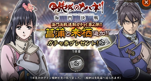 海門決戦の「菖蒲」「来栖」登場を記念して、「ガチャ券」1枚を配布いたします。
