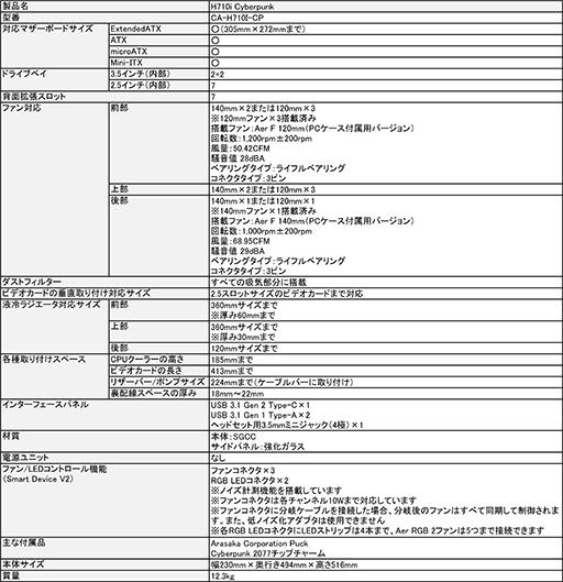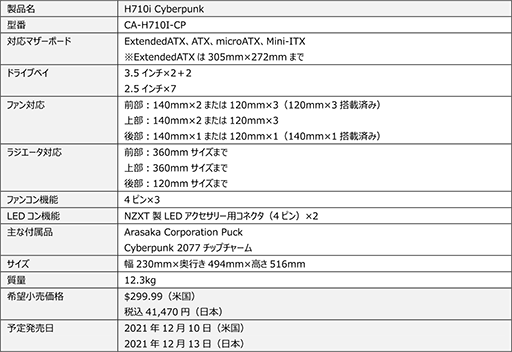 NZXT「H710i Cyberpunk」スペック表