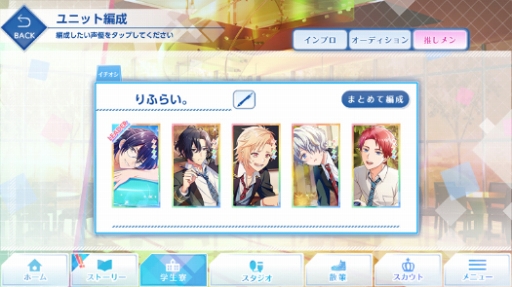 「Hot-Blood」「Re:Fly」「エメ☆カレ」「MAISY」「Prid's」「drop」。この6組の声優ユニットに所属している29人の生徒を次々に説得していき,仲間を増やしていくような形でメインストーリーは進んでいく。