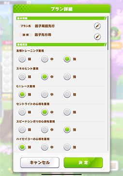 このおまかせ育成がかなり便利で,デフォルトで用意されているもののほか,いろいろとカスタマイズができます。その内容はかなり細かく,コンティニューをするかどうかや優先して取得するスキル,友情トレーニングの優先度など,多岐にわたる設定が可能となっています。