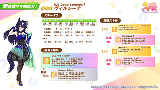 ゲーム内の性能はマイル/中距離向けの逃げ/先行ウマ娘となっており,特にマイルを得意とするようだ。固有スキル「Queen’s Rebirth」は芝限定で,マイル/中距離で特効となっている。また,進化スキルはいずれもマイルでのみ発動する効果付きとなる。