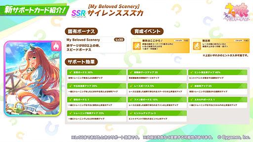 新サポートとしてSSRサイレンススズカ,SRカレンブーケドールも実装された。SSRサイレンススズカはレアスキル「勝負はここから!」「脱出術」のいずれかを取得できる根性タイプのサポートで,逃げウマ娘の育成に特化した性能となっている。