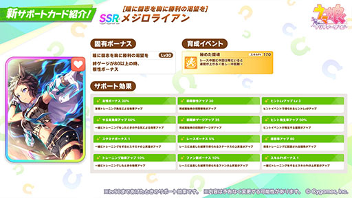 SSRメジロライアン,SRカワカミプリンセスも同時刻に実装予定だ。SSRメジロライアンの一部性能も公開されており,差し・中距離専用のレアスキル「秘めた闘魂」を取れるスタミナサポートとなる。
