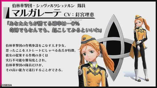 伯林華撃団の作戦参謀をこなす天才少女。思ったことをストレートにしゃべる毒舌が特徴。彼女の提案する作戦の多くは実行不可能な難易度とされ、伯林華撃団の隊員だけが、その高い能力で遂行することができる。
