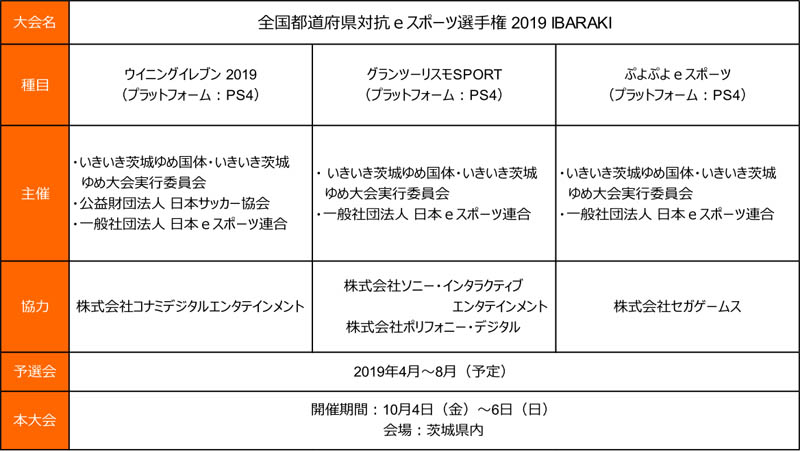 「ウイニングイレブン2019」に加えて,「グランツーリスモSPORT」と「ぷよぷよeスポーツ」の採用が明らかになった,「全国都道府県対抗eスポーツ選手権 2019 IBARAKI」