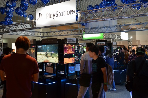 入口から左手側にはPlayStationブースが出展。こちらでは,PS4/PS Vitaで遊べる14タイトルが試遊できる。出展タイトルの詳細は,PlayStation.Blogの「こちら 」のページでご確認を