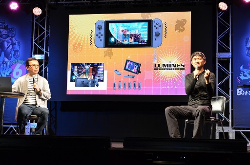 ステージに登壇した,ブレインストームの中村隆之氏 (左)とエンハンスの水口哲也氏 (右)。6月26日に発売予定の「ルミネス リマスター」 について,水口氏はNintendo SwitchのHDハプティクス機能を知って「ぜひやろう!」となったという。また,水口氏と共に「ルミネス」「メテオス」シリーズのサウンドを手掛けてきた中村氏は,初代「ルミネス」のプロトタイプを触ったときに感動したと当時を振り返った