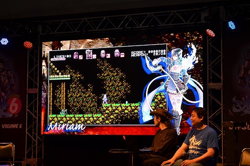 インティ・クリエイツの新作発表セッションに,ArtPlayの五十嵐孝司氏 (左)と,インティ・クリエイツの會津卓也氏 (右)が登場。発表されたばかり の「Bloodstained: Curse of the Moon」 の映像を披露した