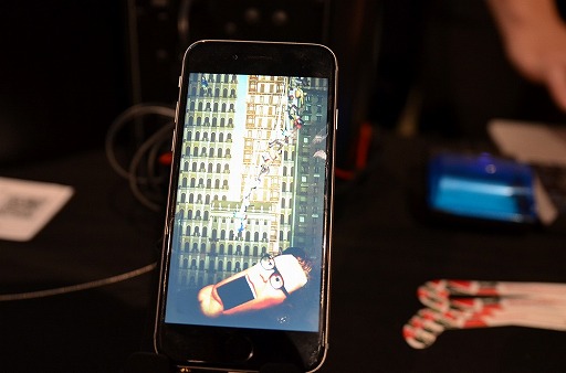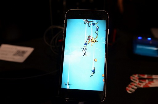 「Sticky Bodies」 。空から落ちてくる人間をスワイプ操作でつなげて,地面で待ち構える大きな顔の口の中に飛び込ませるという,シュールな世界観が特徴的。現時点では製品化の予定はないとのことなので,会場で触れてみよう。