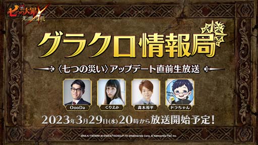 近日実施予定のアップデート情報をいち早くお届けする公式番組「第43回グラクロ情報局 〜〈七つの災い〉アップデート直前生放送〜」を、3月29日(水)20:00より放送いたします。