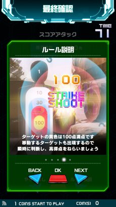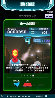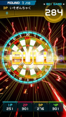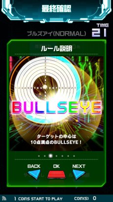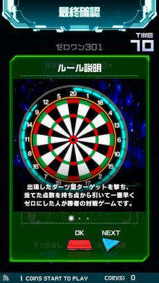 ダーツの「ゼロワン」のルールで,画面に表示されるダーツボードを撃って,合計点数を301点もしくは501点にピッタリ合わせる,という対戦モード。撃つと点数が引かれていき,残り点数をオーバーするとバーストになって,やり直しとなる。先に規定の点数をピッタリ出したプレイヤーの勝利。推奨BB弾数は約60発だ。