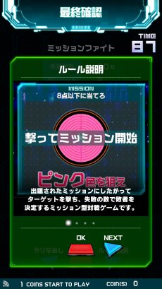 2〜4人まで参加できるマルチプレイモード。画面に表示されるミッションに従って,交代しながらターゲットを狙っていく。ミッションは,例えば「ピンク色を狙え」とか「8点以下に当てろ」といった感じで,ゲームを重ねるごとに難しくなっていく模様。3回ミスしたプレイヤーが負けとなり罰ゲームを受ける。推奨BB弾数は約60発で,ゲーム展開次第だが,1マガジンあれば4人でプレイできそうだった。