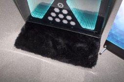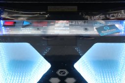 実際のプレイでは,55インチLCDディスプレイに映し出されたターゲットに向かってBB弾を撃つわけだが,普通のディスプレイでは当然ながら壊れてしまいかねないので,画面の手前に透明な跳ね返り防止材がセットされている。これにより,約2.4mの距離からパワーのあるエアソフトガンで撃っても衝撃が吸収され,スクリーン下に弾が落下する仕組みとなっている。なお落ちたBB弾は,回収口を通って筐体下側の受け皿に集められるとのこと。またこの跳ね返り防止材は,筐体の上下左右にもそれぞれセットされていて,極力周囲にBB弾が跳ばないように工夫が施されているとのことだった。