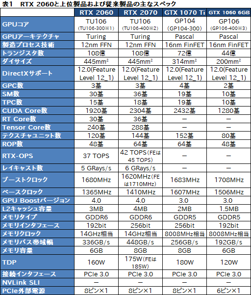 表1は,ここまで紹介した内容を基に,RTX 2060のスペックをRTX 2070,そして「GeForce GTX 1070 Ti」(以下,GTX 1070 Ti),GTX 1060 6GBと比較したものになる。