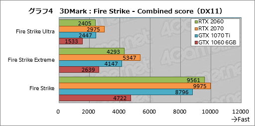 総合スコアから「Graphics score」を抜き出したものがグラフ2だが,ここでRTX 2060のスコアはRTX 2070の77〜83%程度,GTX 1070 Tiの89〜98%程度,GTX 1060 6GBの141〜150%程度。総合スコアをおおむね踏襲するものの,RTX 2070およびGTX 1070 Tiとのギャップはやや広がり,GTX 1060 6GBとのギャップはやや縮まった。