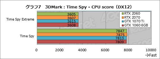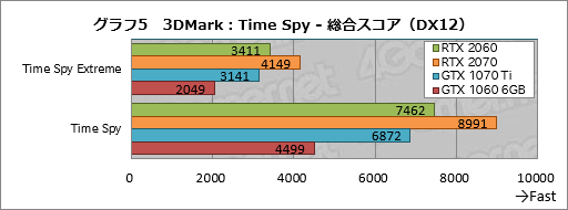 続いてグラフ6はTime SpyのGPUテスト結果を抜き出したものだが,ここでRTX 2060はGeForce GTX 10シリーズとのスコア差をさらに広げている。対GTX 1070 Tiでは約10%,対GTX 1060 6GBでは77〜78%程度も高いスコアだ。