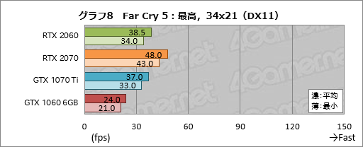 まずグラフ8〜10は「Far Cry 5」のテスト結果だが,RTX 2060の平均フレームレートはRTX 2070比で80〜88%程度で,GTX 1070 Tiを安定して上回り,また置き換え対象となるGTX 1060 6GBに対しては47〜60%程度高いスコアを示している。