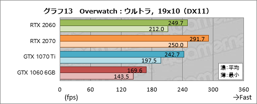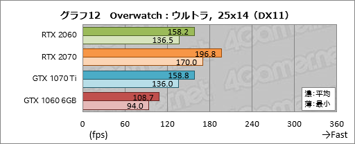 続いて「Overwatch」の結果がグラフ11〜13だが,ここでRTX 2060はGTX 1070 Tiといい勝負を演じている。GTX 1060 Tiとのスコア差は50%弱だが,1920