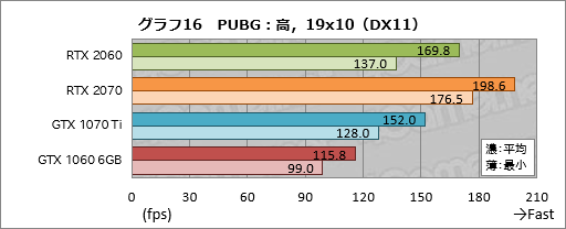 グラフ14〜16の「PLAYERUNKNOWN'S BATTLEGROUNDS」(以下,PUBG)でも,RTX 2060は平均フレームレートでGTX 1070 Tiに対して3〜17%程度,GTX 1060 6GBに対して47〜59%程度と安定して高いスコアを示した。1920