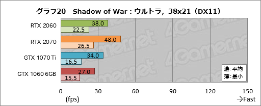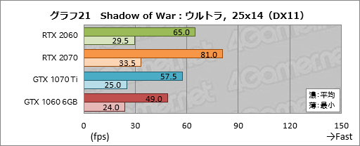 高解像度テクスチャパックを導入しているため,メモリ周りの負荷が非常に高くなっている「Middle-earth: Shadow of War」(以下,Shadow of War)。そのスコアをまとめたものがグラフ20〜22だが,はたしてここではGDDR6メモリを採用してメモリバス帯域幅が大きくなっているRTX 2060がGeForce GTX 10シリーズに対して優勢に立ち回っている。