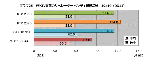 FFXIV紅蓮のリベレーター ベンチの最小フレームレートはCPU性能への依存度が高い一方,GeForce RTX 20シリーズでGeForce GTX 10シリーズより若干低い数字が出やすいのだが,案の定,RTX 2060は上位モデルであるRTX 2070と並んでGTX 1070 Tiより4fps低かった。