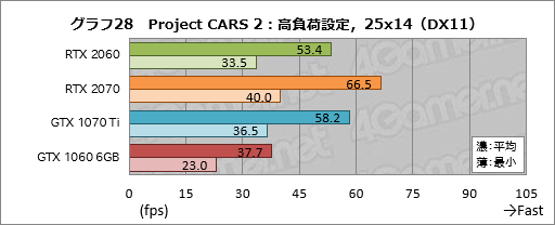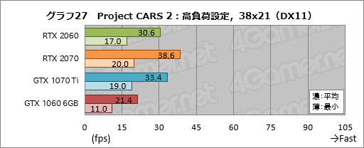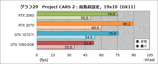 次にグラフ27〜29は「Project CARS 2」の結果だが,ここだとRTX 2060は平均フレームレートでGTX 1070 Tiの92〜99%程度で,端的に述べて届いていない。GTX 1060 6GBとの平均フレームレート差も42〜43%程度と縮まり気味だ。Project CARS 2はそれほどメモリ周りの負荷が高いタイトルではないため,GPUの地力勝負になりやすいのだが,その傾向が出たといったところか。