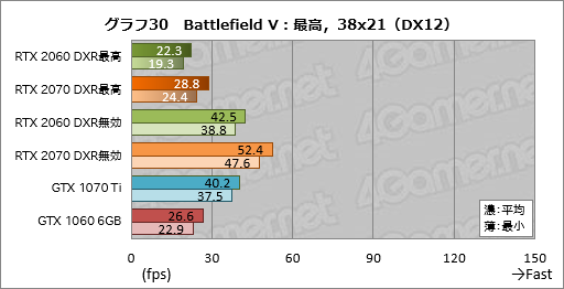 グラフ中において,GeForce RTX 20シリーズでDirectX Raytracingの「最高」設定を行った状態は「DXR 最高」,DirectX Raytracingを無効化した状態は「DXR 無効」と表記して区別するが,最も負荷が高く,かつ最も良好なリアルタイムレイトレーシング結果が得られるとされる「最高」設定を適用した状態で,RTX 2060は1920
