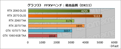 グラフ33はFFXVベンチの結果で,グラフ34はその平均および最小フレームレートをまとめたものだ。グラフ中ではGPU名の後ろに「DLSS」「TAA」と付記することでどちらを適用したか区別しているが,RTX 2060はDLSSを適用することでTAA適用時と比べて約34%もスコアが向上した。結果としてGTX 1060 6GB比で2倍以上という総合スコアを示し,最小フレームレートも18fpsから30.5fpsに上がるのだから,やはりインパクトは大きい。