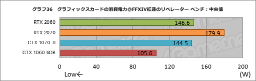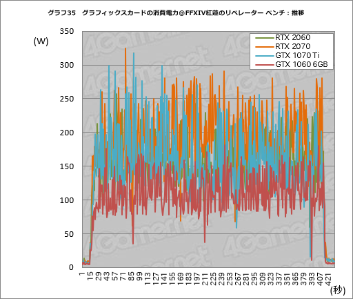 「4Gamer GPU Power Checker」(Version 1.1)を用いて,FFXIV紅蓮のリベレーター ベンチ実行時におけるカード単体の消費電力推移をまとめたものがグラフ35となる。