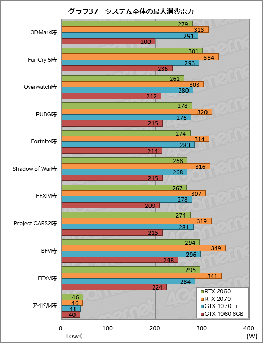 グラフ35から中央値を求めたものがグラフ36で,RTX 2060のスコアはGTX 1060 6GB比で40W以上高い。ちょうどTDPの違いと同程度のギャップがあるわけだ。