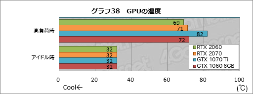 その結果がグラフ38である。GPUごとに温度センサーの位置は異なり,また,温度の制御法もGPUクーラーも異なるため,横並びの評価に意味はない。それを踏まえたうえでスコアを見てみると,RTX 2060が高負荷時でも70℃を割っているのが目を惹く。消費電力がGTX 1060 6GBより目に見えて大きいことも考慮するに,RTX 2060 Founders Editionが搭載する純正GPUクーラーはなかなか優秀と言っていいだろう。