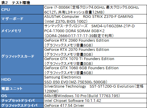グラフィックスドライバは,RTX 2060のテスト用としてNVIDIAが全世界のレビュワー向けに配布した「GeForce 417.54 Driver」を用いる。OSのWindows 10は,「October 2018 Update」を適用したうえで,とくに断りのない限り「電源プラン」は「高パフォーマンス」で統一した。そのほかテスト環境は表2のとおりとなる。