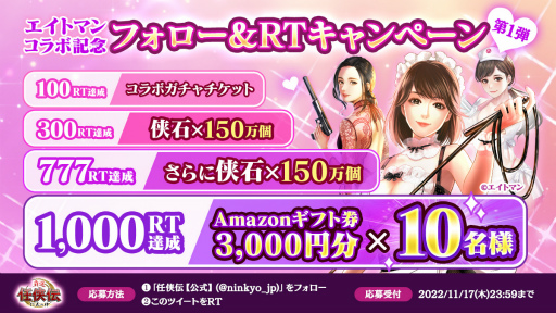 「任侠伝」公式Twitter(https://twitter.com/ninkyo_jp)の対象ツイートをリツイートすると、リツイート数に応じてゲーム内アイテムがもらえるTwitterキャンペーンを開催いたします。